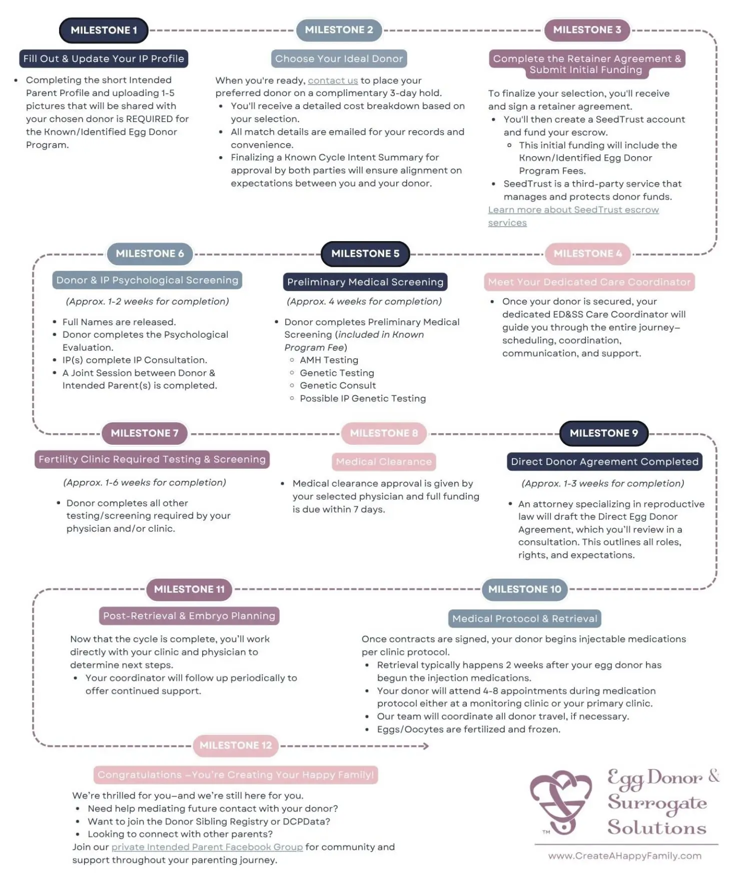 After Identified Donor Preliminary Medical Screening, the Egg Donor & Intended Parents will meet via an online platform and Egg Donor & Surrogate Solutions will release the intended parent’s and the egg donor’s full legal names. Upon a live birth, agreed-upon contact information will be released to each party, the donor’s DOB will be released, and all parties will be encouraged to sign up for DCPData, the Donor Sibling Registry, or a similar program.